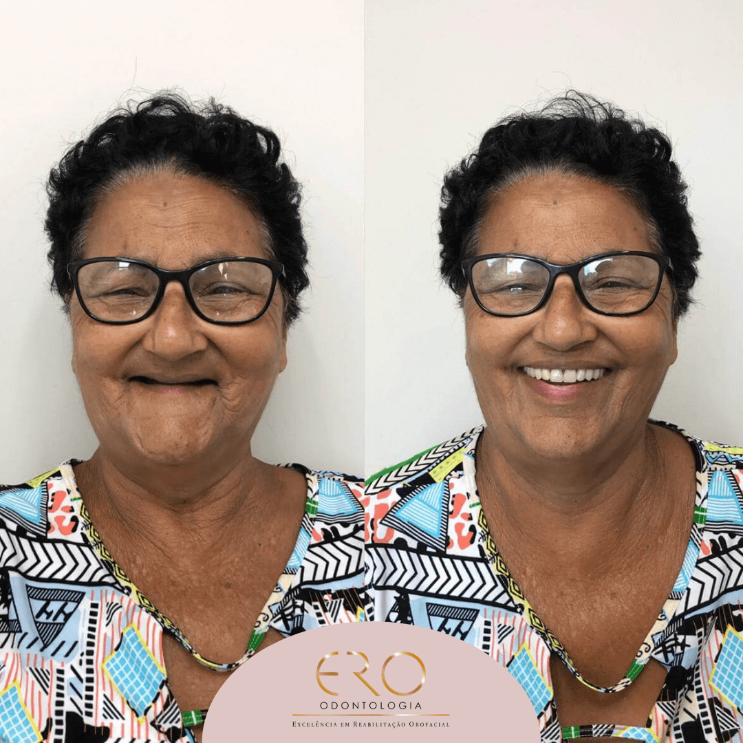 Maria Vicentina que mudou sua vida ao voltar a sorrir e mastigar todos os alimentos que tanto gosta com as próteses fixas sobre implantes.